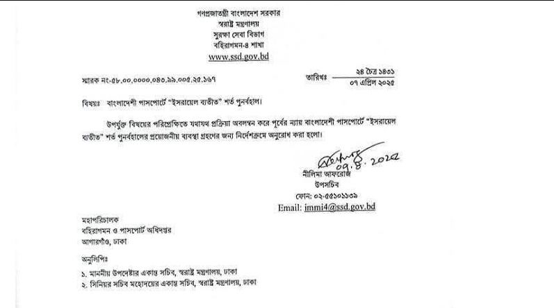বাংলাদেশি পাসপোর্টে বহুদিন বাদে আবার ফিরে এলো সেই বহুল আলোচিত ও রাজনৈতিকভাবে গুরুত্বপূর্ণ ‘ইসরায়েল ব্যতীত’ শর্ত। স্বরাষ্ট্র মন্ত্রণালয়ের উপসচিব নীলিমা আফরোজের স্বাক্ষর করা একটি চিঠির মাধ্যমে এই সিদ্ধান্ত বহিরাগমন ও পাসপোর্ট অধিদপ্তরের মহাপরিচালকের কাছে পাঠানো হয়েছে। এতে স্পষ্ট নির্দেশনা দেওয়া হয়েছে—পাসপোর্টে ‘ইসরায়েল ব্যতীত সকল দেশ ভ্রমণযোগ্য’ এই শর্ত পুনর্বহাল করতে হবে।