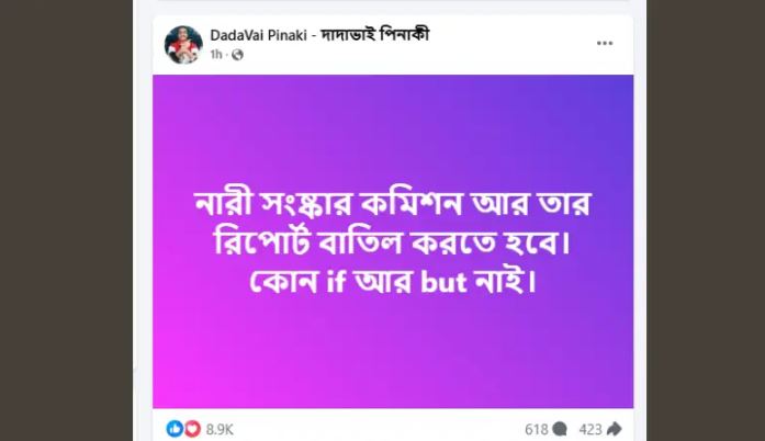 সামাজিক যোগাযোগমাধ্যম ফেসবুকে এক স্ট্যাটাসে তিনি স্পষ্ট ভাষায় বলেন, “নারী সংষ্কার কমিশন আর তার রিপোর্ট বাতিল করতে হবে। কোন if আর but নাই।”