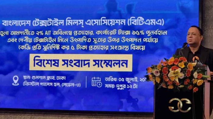 তুলা আমদানিতে ২ শতাংশ অগ্রিম আয়কর (এআইটি) আরোপের সিদ্ধান্ত সোমবারের (৭ জুলাই) মধ্যে প্রত্যাহারের দাবি জানিয়েছে দেশের টেক্সটাইল মিল মালিকেরা। এ সিদ্ধান্ত বাস্তবায়িত হলে শিল্প খাত ধ্বংসের মুখে পড়বে বলে