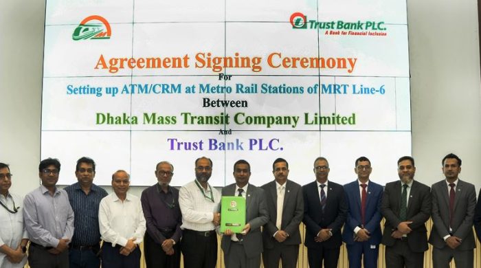 এমআরটি লাইন-৬ এর মেট্রোরেল স্টেশনগুলোর নির্ধারিত স্থানে অটোমেটেড টেলার মেশিন (এটিএম)/ক্যাশ রিসাইক্লার মেশিন (সিআরএম) স্থাপন করবে ট্রাস্ট ব্যাংক পিএলসি। সম্প্রতি ট্রাস্ট ব্যাংক এবং ঢাকা ম্যাস ট্রানজিট কোম্পানি লিমিটেড (ডিএমটিসিএল) এর