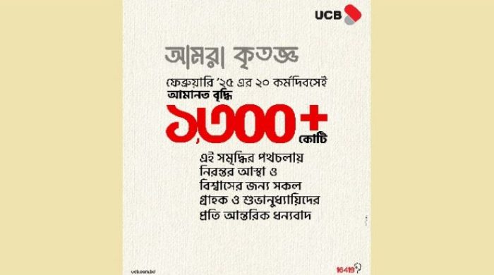 সদ্য শেষ হওয়া ফেব্রুয়ারি মাসে ইউনাইটেড কমার্শিয়াল ব্যাংক (ইউসিবি) ১,৩৩২ কোটি টাকার বেশি সঞ্চয় প্রবৃদ্ধি অর্জন করেছে। মাত্র ২০ কর্মদিবসের একটি মাসে এই পরিমাণ নেট ডিপোজিট বৃদ্ধি, ব্যাংকের প্রতি গ্রাহকদের