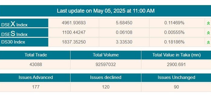 দেশের প্রধান পুঁজিবাজার ঢাকা স্টক এক্সচেঞ্জে (ডিএসই) সপ্তাহের দ্বিতীয় কার্যদিবস সোমবার (০৫ মে) মূল্যসূচকের উত্থানের মধ্য দিয়ে লেনদেন চলছে। বেড়েছে বেশির ভাগ কোম্পানির শেয়ারদর। ডিএসই সূত্রে এ তথ্য জানা গেছে।