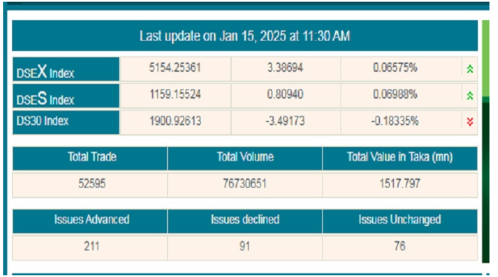 দেশের প্রধান পুঁজিবাজার ঢাকা স্টক এক্সচেঞ্জে (ডিএসই) সপ্তাহের চতুর্থ কার্যদিবস বুধবার (১৫ জানুয়ারি) মূল্যসূচকের মিশ্র প্রতিক্রিয়ার মধ্য দিয়ে চলছে লেনদেন। বেড়েছে অধিকাংশ কোম্পানি ও ফান্ডের শেয়ার ও ইউনিটদর। ডিএসই সূত্রে