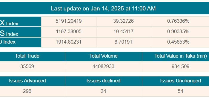 দেশের প্রধান পুঁজিবাজার ঢাকা স্টক এক্সচেঞ্জে (ডিএসই) সপ্তাহের তৃতীয় কার্যদিবস মঙ্গলবার (১৩ জানুয়ারি) মূল্যসূচকের ইতিবাচক প্রতিক্রিয়ার মধ্য দিয়ে চলছে লেনদেন। বেড়েছে অধিকাংশ কোম্পানি ও ফান্ডের শেয়ার ও ইউনিটদর। ডিএসই সূত্রে