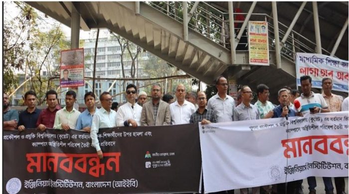 ইঞ্জিনিয়ার্স ইনস্টিটিউশন বাংলাদেশ (আইইবি) এর উদ্যোগে খুলনা প্রকৌশল ও প্রযুক্তি বিশ্ববিদ্যালয় (কুয়েট) এর উপাচার্য ও শিক্ষকদের উপর নির্মম হামলা ও ক্যাম্পাসে অস্থিতিশীল পরিবেশ সৃষ্টির প্রতিবাদে শনিবার জাতীয় প্রেসক্লাবের সামনে দুপুর