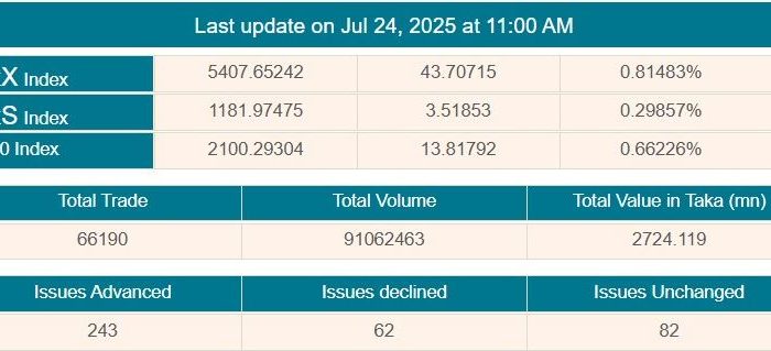 দেশের প্রধান পুঁজিবাজার ঢাকা স্টক এক্সচেঞ্জে (ডিএসই) সপ্তাহের শেষ কার্যদিবস বৃহস্পতিবার (২৪ জুলাই) মূল্যসূচকের উত্থানের মধ্য দিয়ে চলছে লেনদেন। বেড়েছে বেশির ভাগ কোম্পানির শেয়ারদর। ডিএসই সূত্রে এ তথ্য জানা গেছে।