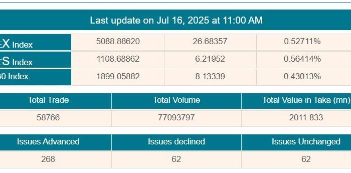 দেশের প্রধান পুঁজিবাজার ঢাকা স্টক এক্সচেঞ্জে (ডিএসই) সপ্তাহের চতুর্থ কার্যদিবস বুধবার (১৬ জুলাই) মূল্যসূচকের উত্থানের মধ্য দিয়ে চলছে লেনদেন। বেড়েছে বেশির ভাগ কোম্পানির শেয়ারদর। ডিএসই সূত্রে এ তথ্য জানা গেছে।