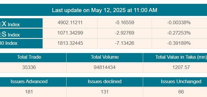 দেশের প্রধান পুঁজিবাজার ঢাকা স্টক এক্সচেঞ্জে (ডিএসই) সপ্তাহের প্রথম কার্যদিবস সোমবার (১২ মে) মূল্যসূচকের পতনের মধ্য দিয়ে লেনদেন চলছে। তবে বেড়েছে বেশির ভাগ কোম্পানির শেয়ারদর। ডিএসই সূত্রে এ তথ্য জানা