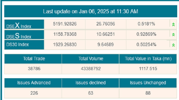 দেশের প্রধান পুঁজিবাজার ঢাকা স্টক এক্সচেঞ্জে (ডিএসই) সপ্তাহের প্রথম কার্যদিবস রবিবার (৫ জানুয়ারি) মূল্যসূচকের উত্থানের মধ্য দিয়ে চলছে লেনদেন। কমেছে অধিকাংশ কোম্পানি ও ফান্ডের শেয়ার ও ইউনিটদর। ডিএসই সূত্রে এ