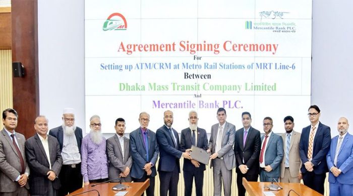 মেট্রোরেলের মতিঝিল, ঢাকা বিশ্ববিদ্যালয় ও ফার্মগেট স্টেশনে এটিএম/সিআরএম স্থাপনের লক্ষে মার্কেন্টাইল ব্যাংকের সাথে মেট্রোরেল কর্তৃপক্ষ ঢাকা মাস ট্রানজিট কোম্পানি লিমিটেড (ডিএমটিসিএল) একটি চুক্তি স্বাক্ষরিত হয়েছে। গতকাল বুধবার (১২ ফেব্রুয়ারি) রাজধানীর